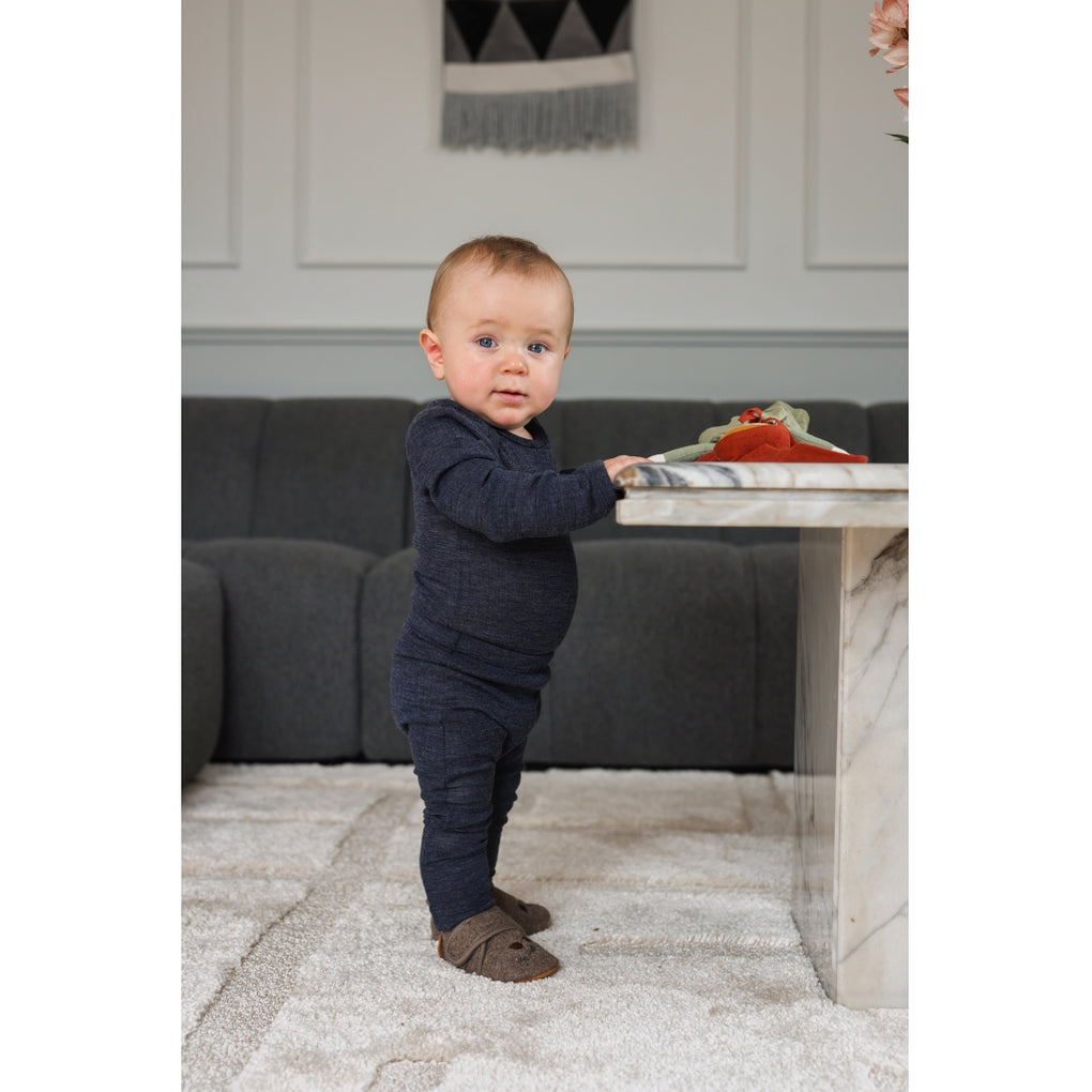 Ensfarvede uld/bambus baby leggings fra mikk-line. Det er et par bløde, strækbare og holdbare underdele, der er perfekte til det lille barns hverdagsgarderobe. Bukserne er lavet af en blanding af de naturlige materialer uld og bambus, tilsat spandex for stræk, så de giver barnet en høj komfort og bevægelsesfrihed. Kvaliteten er samtidig med til at sikre barnet en stabil kropstemperatur, og de er særligt velegnede til sensitiv hud.