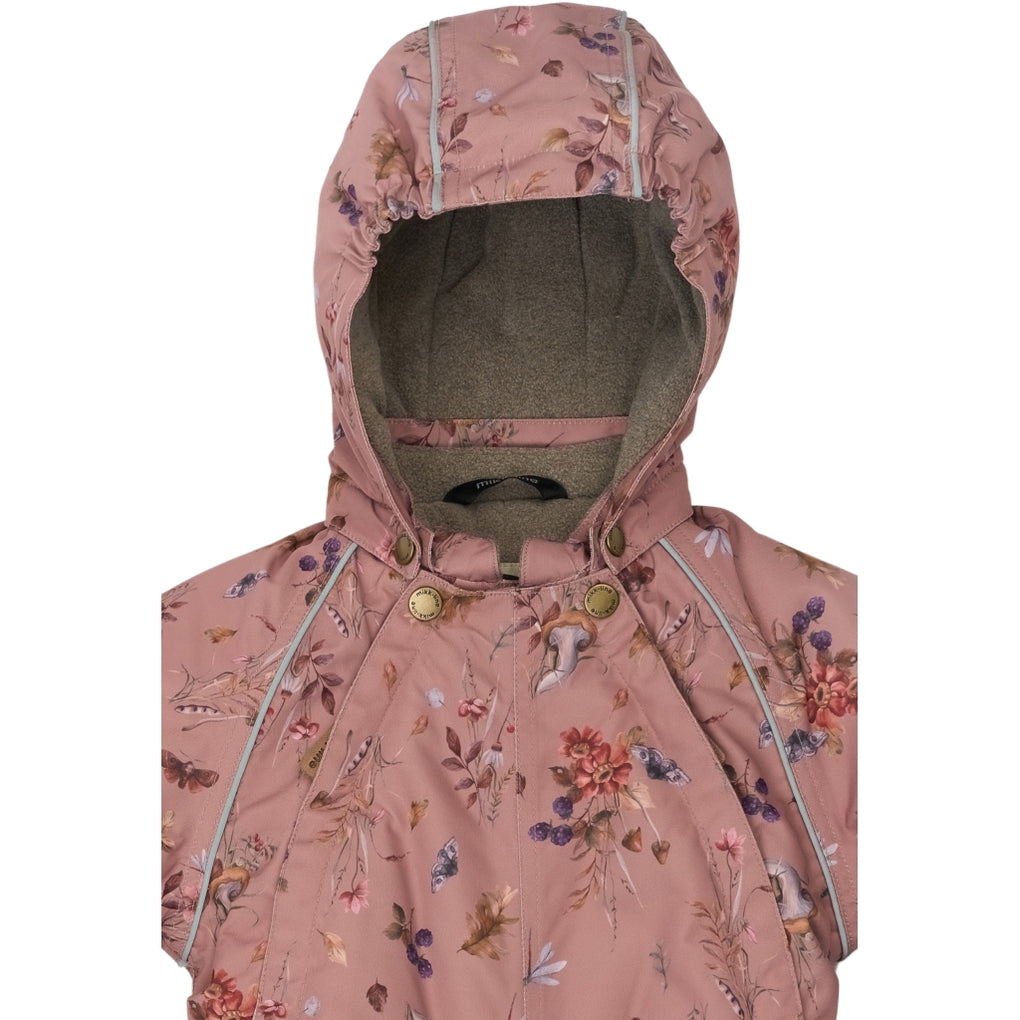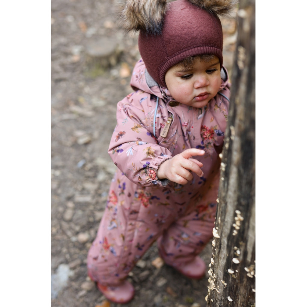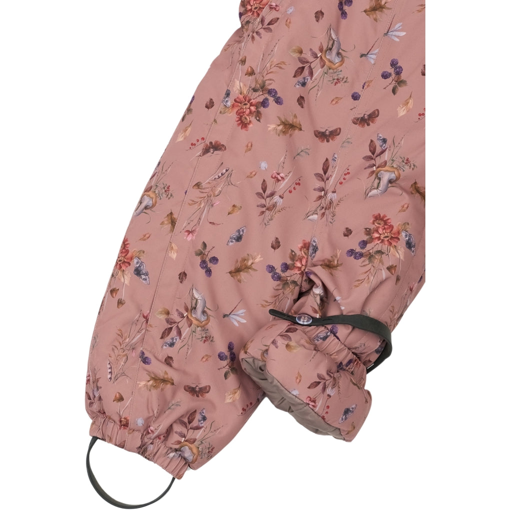 Mikk-line baby flyverdragt med et fint, blomstret print. I denne lækre flyverdragt kan barnet lege og udforske naturen under den åbne himmel i alt slags vejr i løbet af de kolde og våde efterår- og vintermåneder. Flyverdragtens yderstof er lavet af 100% genanvendt polyester og polstret med polyesterfyld. Hætten og overkroppen har blødt fleece foer, hvorimod ærmerne og benene har en glat og gnidningsfri indvendig overflade. Vi har anvendt Solution Dye til farvning af det glatte for, da det bl.a. mindsker forbruget af vand i produktionen. Den er naturligvis også fluorfri med BIONIC-FINISH® ECO imprægnering.