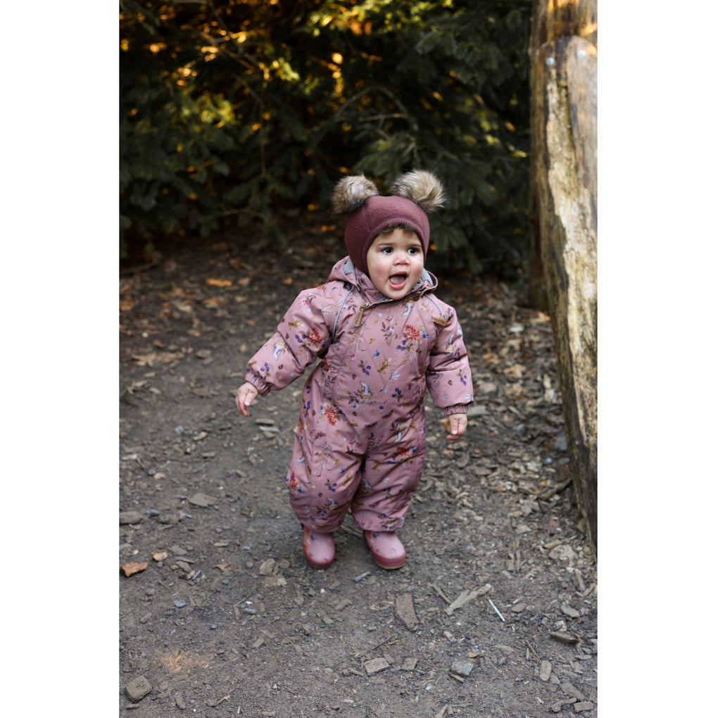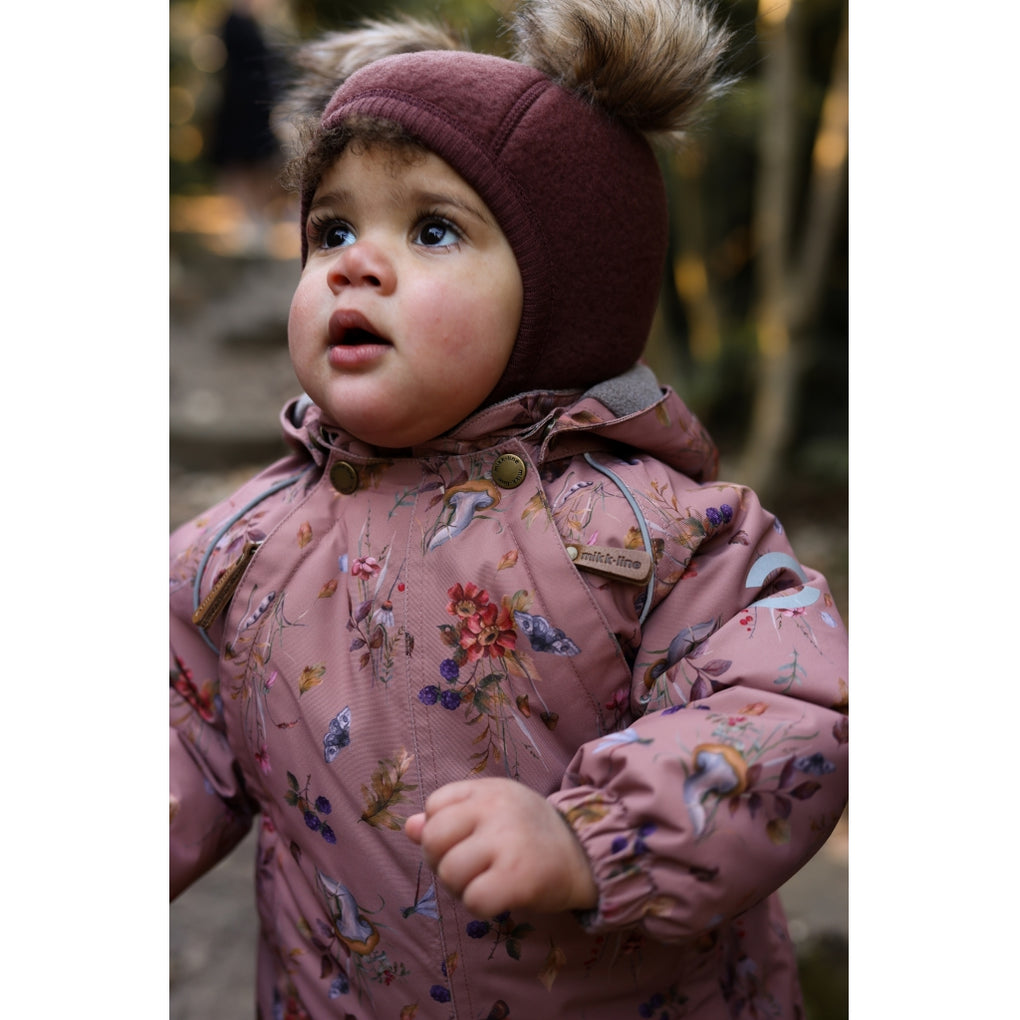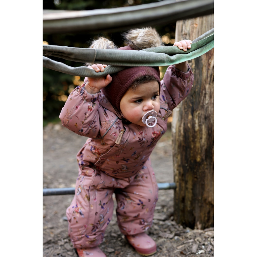 Mikk-line baby flyverdragt med et fint, blomstret print. I denne lækre flyverdragt kan barnet lege og udforske naturen under den åbne himmel i alt slags vejr i løbet af de kolde og våde efterår- og vintermåneder. Flyverdragtens yderstof er lavet af 100% genanvendt polyester og polstret med polyesterfyld. Hætten og overkroppen har blødt fleece foer, hvorimod ærmerne og benene har en glat og gnidningsfri indvendig overflade. Vi har anvendt Solution Dye til farvning af det glatte for, da det bl.a. mindsker forbruget af vand i produktionen. Den er naturligvis også fluorfri med BIONIC-FINISH® ECO imprægnering.
