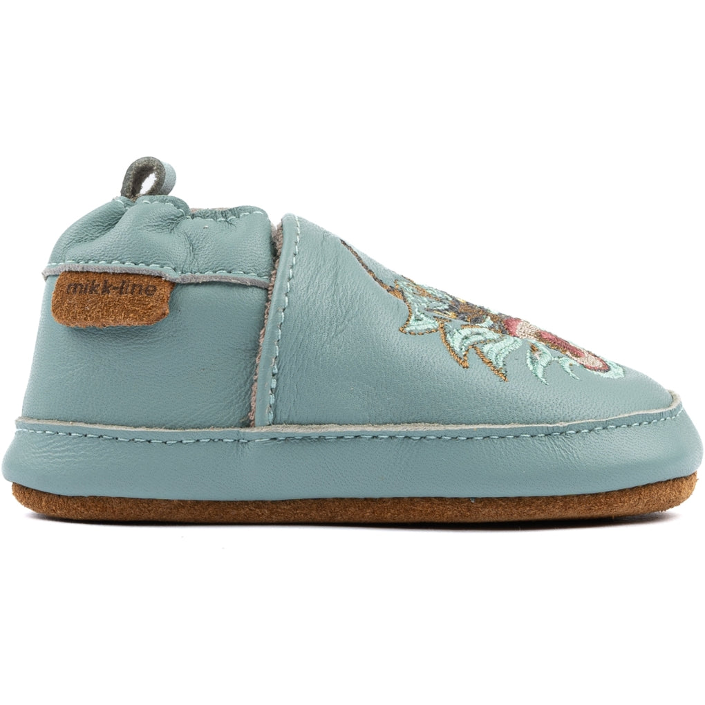 Bedårende læderfutter med dyremotiv fra mikk-line til babyer og børn. Disse fine hjemmesko holder barnets små fødder dejligt lune, samt mindsker risikoen for at barnet glider og falder på glatte gulve. Futterne har en bredere pasform end lignende indendørssko, så der god plads til den lille fod. De har samtidig et godt greb om anklerne, og glider derfor ikke af de små fødder.