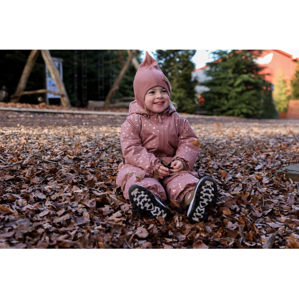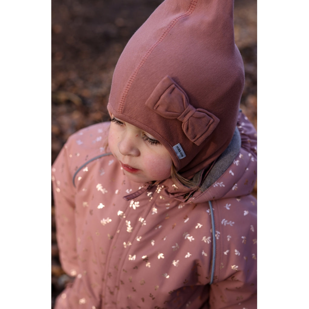 Ensfarvet mikk-line elefanthue med en fin sløjfe på fronten og vindstop ved ørerne. Denne lækre vinterhue dækker det meste af barnets hoved, hals og ansigt, så den beskytter barnet mod kulde og vind, når det leger og udforsker naturen under den åbne himmel. Huen fås i dobbeltstørrelser fra 74/80 til 134/140 cm (ca. 9 måneder til 10 år).