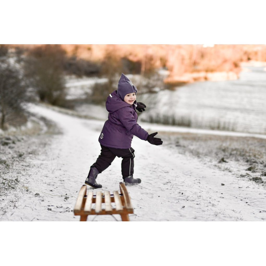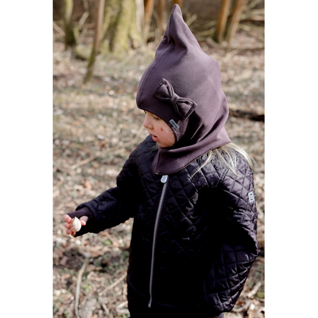 Ensfarvet mikk-line elefanthue med en fin sløjfe på fronten og vindstop ved ørerne. Elefanthuen er lavet af bomuld på indersiden og en blanding af merinould og akryl på ydersiden. Denne lækre vinterhue dækker det meste af barnets hoved, hals og ansigt, så den beskytter barnet mod kulde og vind, når det leger og udforsker naturen under den åbne himmel. Huen fås i dobbeltstørrelser fra 74/80 til 134/140 cm (ca. 9 måneder til 10 år).