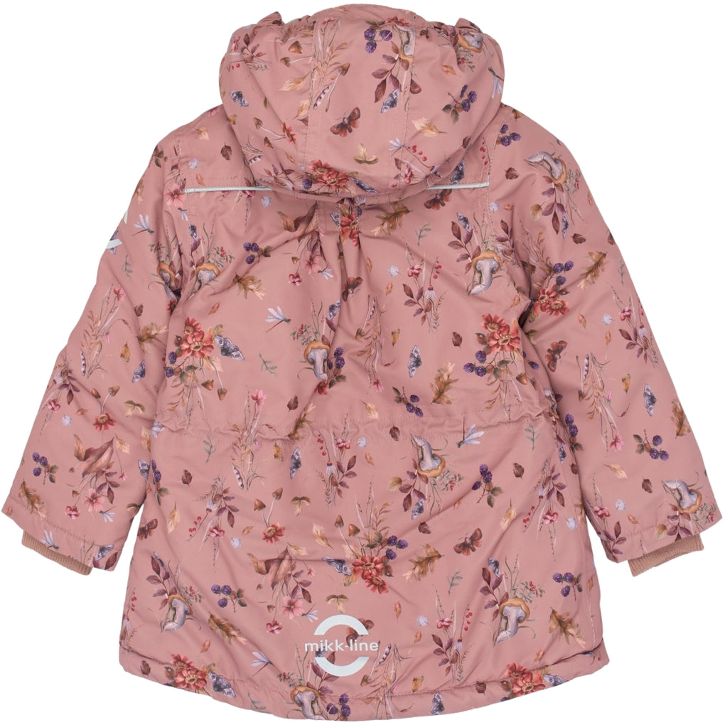 Mikk-line vinterjakke med et fint blomsterprint. I denne lækre vinterjakke kan barnet lege og udforske naturen under den åbne himmel i alt slags vejr i løbet af de kolde og våde efterår- og vintermåneder. Jakkens yderstof er lavet af 100% genanvendt polyester og polstret med polyesterfyld. Hætten, kraven og kroppen har blødt fleece foer, hvorimod ærmerne og lommerne har en glat og gnidningsfri indvendig overflade. Vi har anvendt Solution Dye til farvning af det glatte for, da det bl.a. mindsker forbruget af vand i produktionen. Derudover er den imprægneret med fluorfri BIONIC-FINISH® ECO imprægnering.