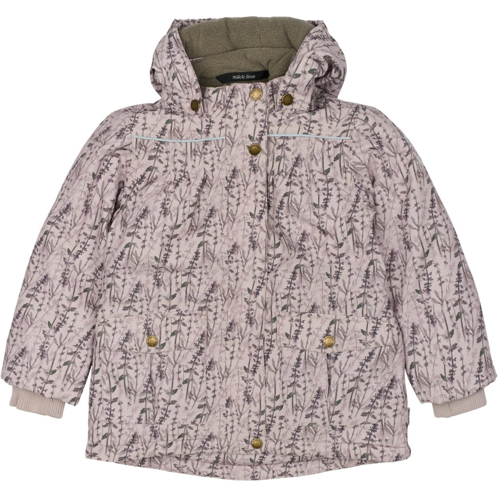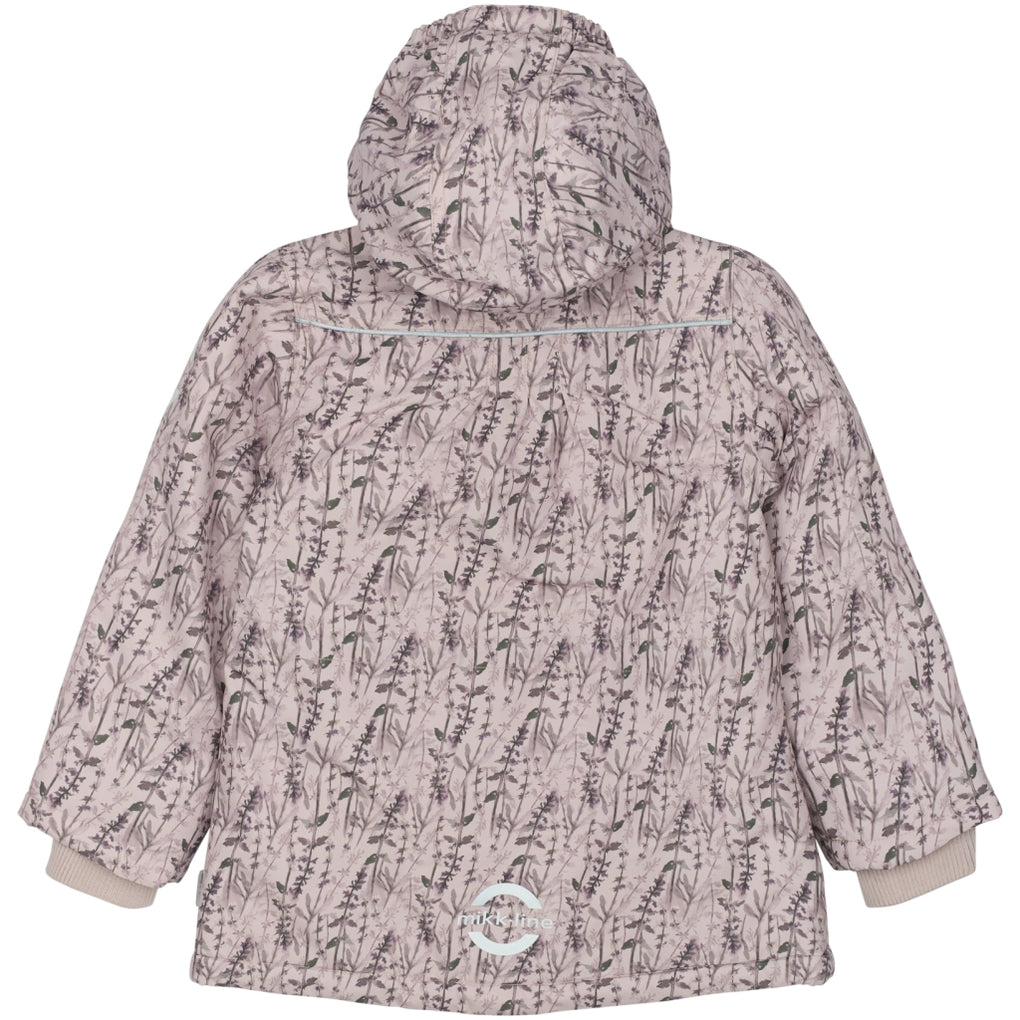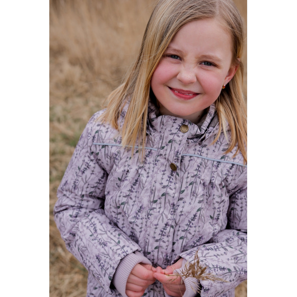 Mikk-line vinterjakke med et fint blomsterprint. I denne lækre vinterjakke kan barnet lege og udforske naturen under den åbne himmel i alt slags vejr i løbet af de kolde og våde efterår- og vintermåneder. Jakkens yderstof er lavet af 100% genanvendt polyester og polstret med polyesterfyld. Hætten, kraven og kroppen har blødt fleece foer, hvorimod ærmerne og lommerne har en glat og gnidningsfri indvendig overflade. Vi har anvendt Solution Dye til farvning af det glatte for, da det bl.a. mindsker forbruget af vand i produktionen. Derudover er den imprægneret med fluorfri BIONIC-FINISH® ECO imprægnering.