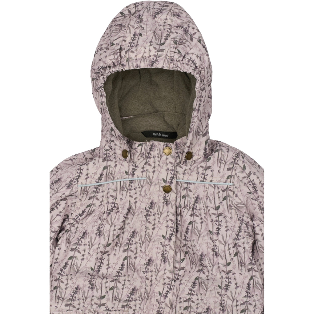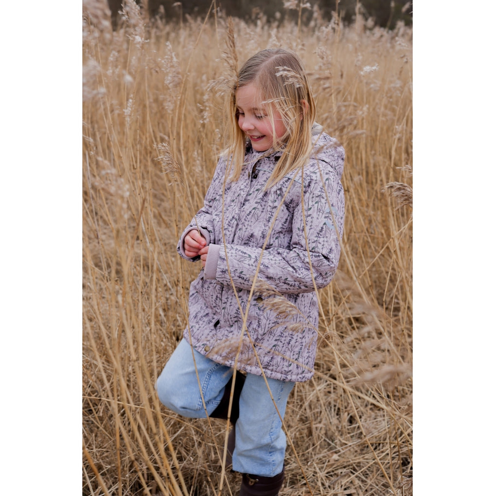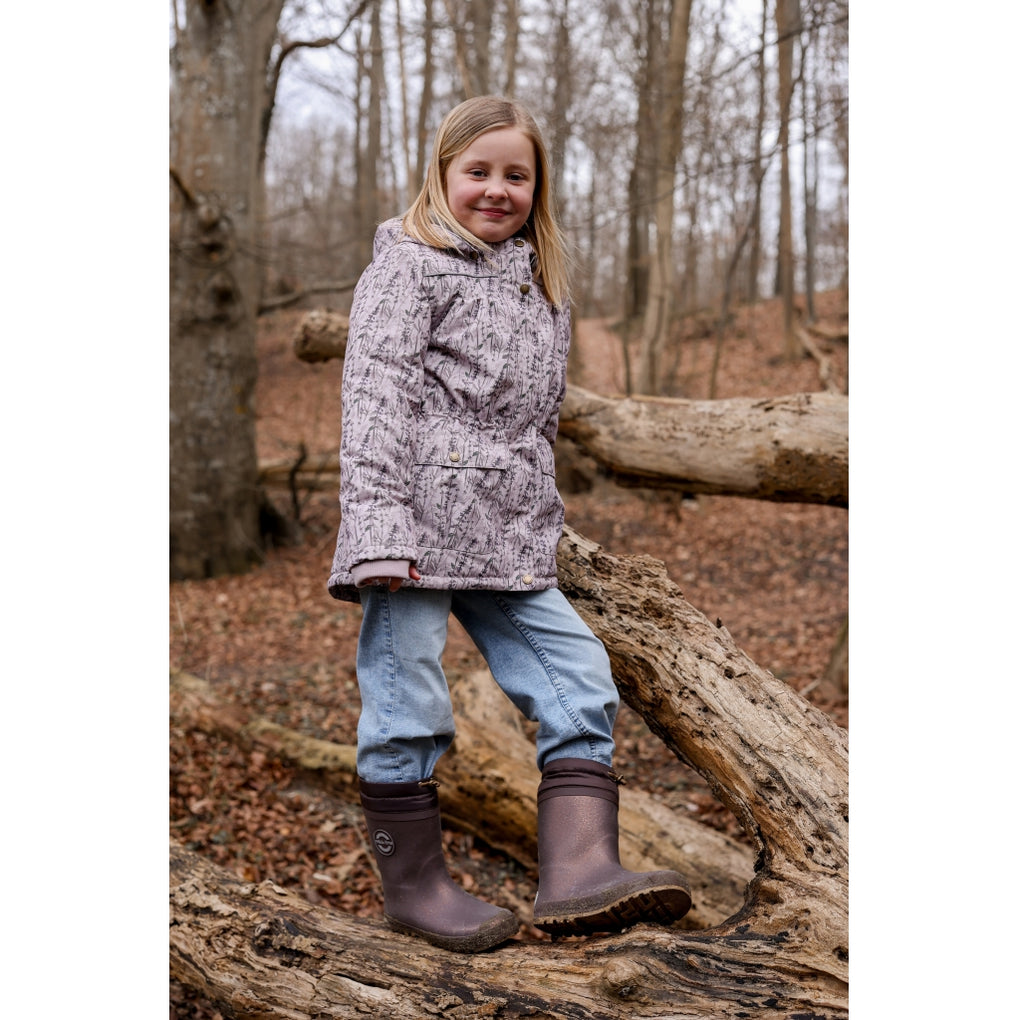 Mikk-line vinterjakke med et fint blomsterprint. I denne lækre vinterjakke kan barnet lege og udforske naturen under den åbne himmel i alt slags vejr i løbet af de kolde og våde efterår- og vintermåneder. Jakkens yderstof er lavet af 100% genanvendt polyester og polstret med polyesterfyld. Hætten, kraven og kroppen har blødt fleece foer, hvorimod ærmerne og lommerne har en glat og gnidningsfri indvendig overflade. Vi har anvendt Solution Dye til farvning af det glatte for, da det bl.a. mindsker forbruget af vand i produktionen. Derudover er den imprægneret med fluorfri BIONIC-FINISH® ECO imprægnering.