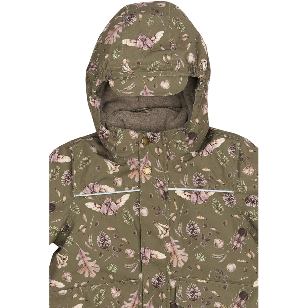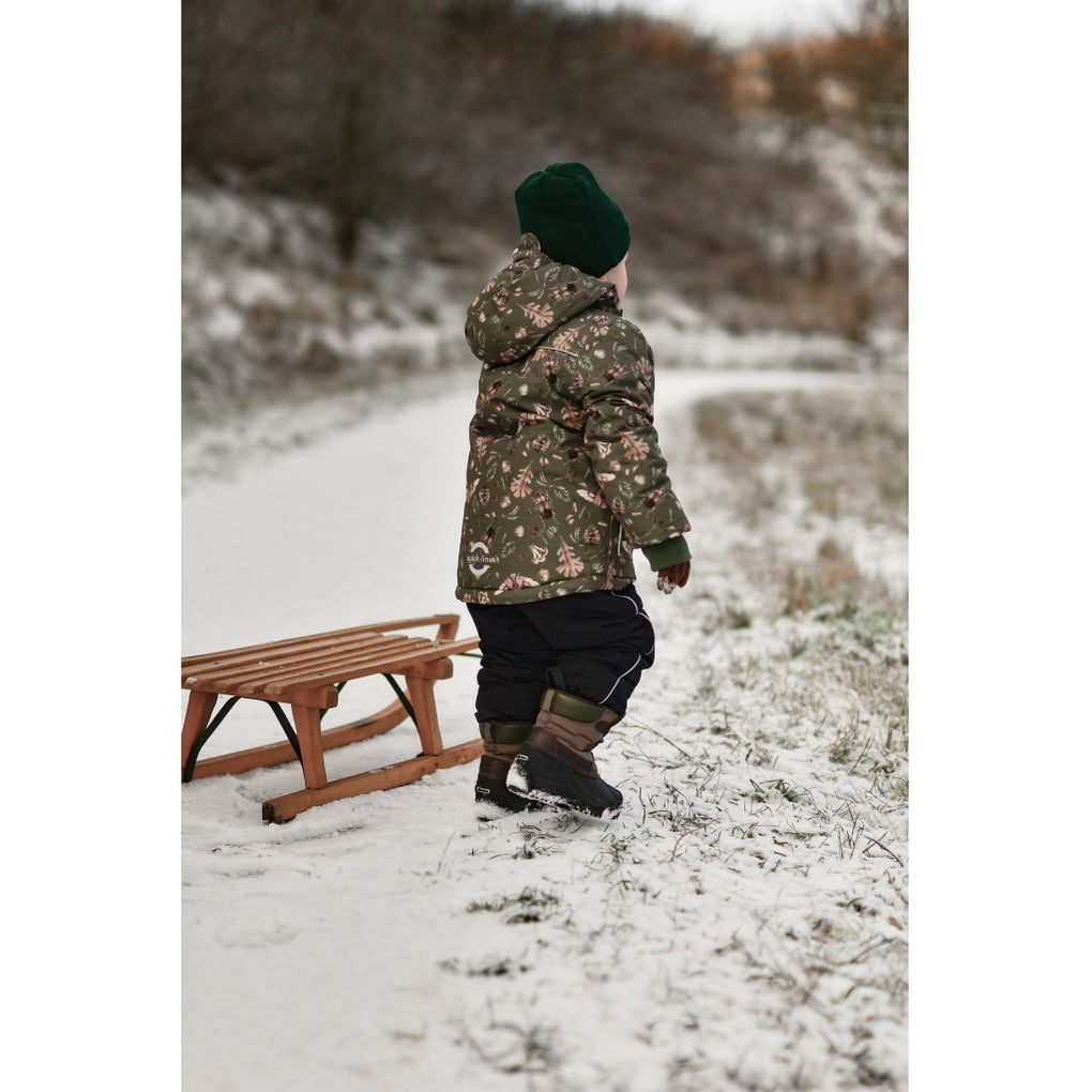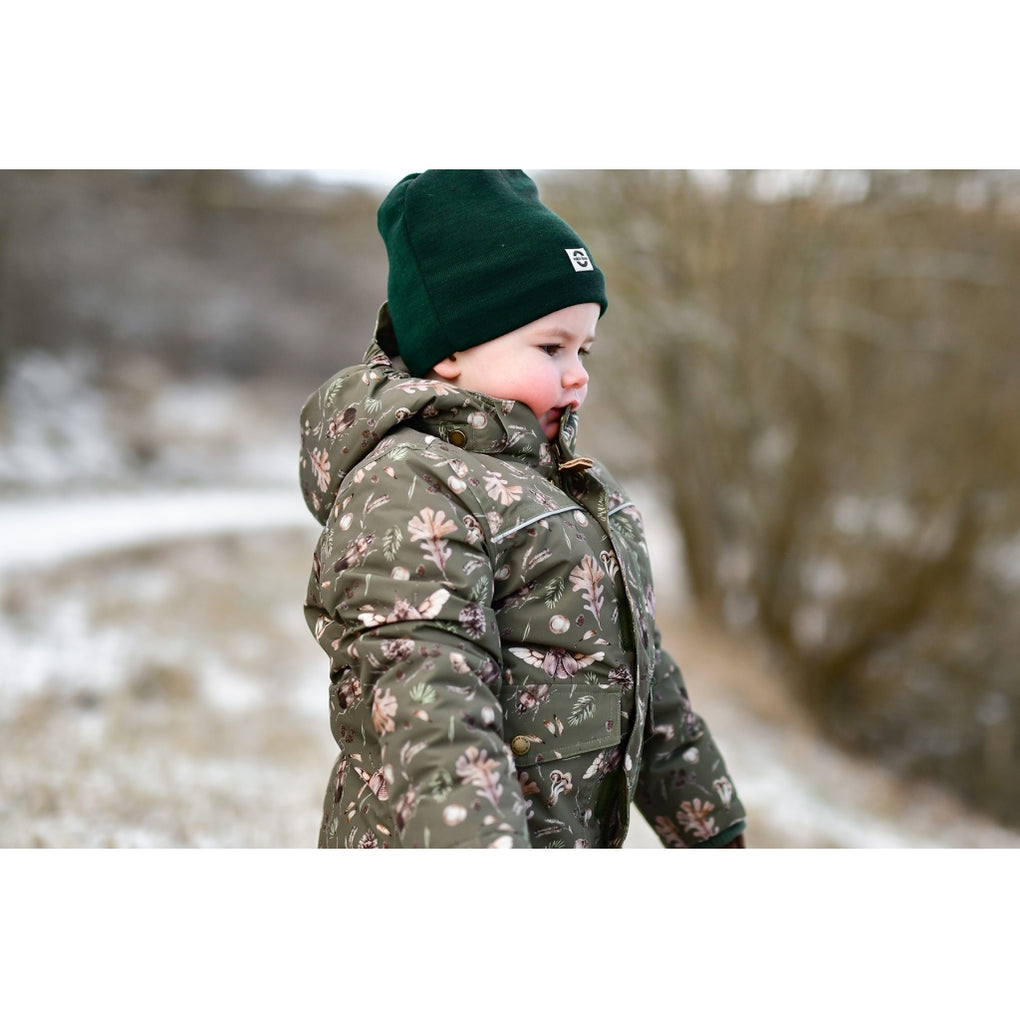 Mikk-line vinterjakke med et sejt print af hjorte der gemmer sig i skoven. I denne lækre vinterjakke kan barnet lege og udforske naturen under den åbne himmel i alt slags vejr i løbet af de kolde og våde efterår- og vintermåneder. Jakkens yderstof er lavet med 66% genanvendt polyester og polstret med polyesterfyld. Hætten, kraven og kroppen har blødt fleece foer, hvorimod ærmerne og lommerne har en glat og gnidningsfri indvendig overflade. Vi har anvendt Solution Dye til farvning af det glatte for, da det bl.a. mindsker forbruget af vand i produktionen. Derudover er den imprægneret med fluorfri BIONIC-FINISH® ECO imprægnering.