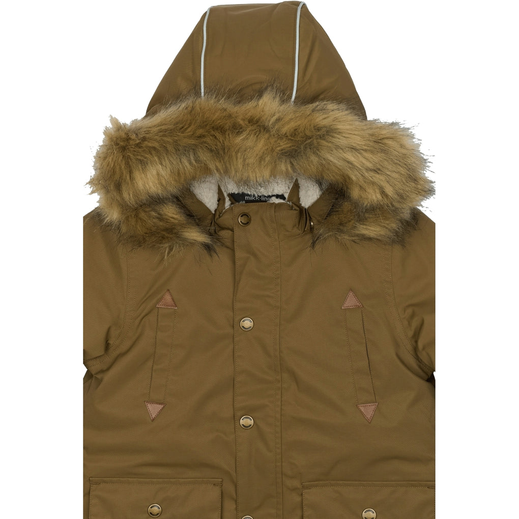 Mikk-line twill parka vinterjakke til drenge, der elsker leg og eventyr i naturen og under åben himmel. Denne smukke vinterjakke af nylon har en særlig god kvalitet og kan holde til de mest ekstreme vejrforhold med vind, regn og sne. Jakken er lavet af nylon beklædt med en klar TPU membran, og den indeholder ekstra kraftig polyesterfyld. Hætten, kraven og det øverste af kroppen har superblødt teddy foer, hvorimod ærmerne, lommerne og det nederste af kroppen har en glat og gnidningsfri indvendig overflade. Den er imprægneret med fluorfri BIONIC-FINISH® ECO imprægnering.
