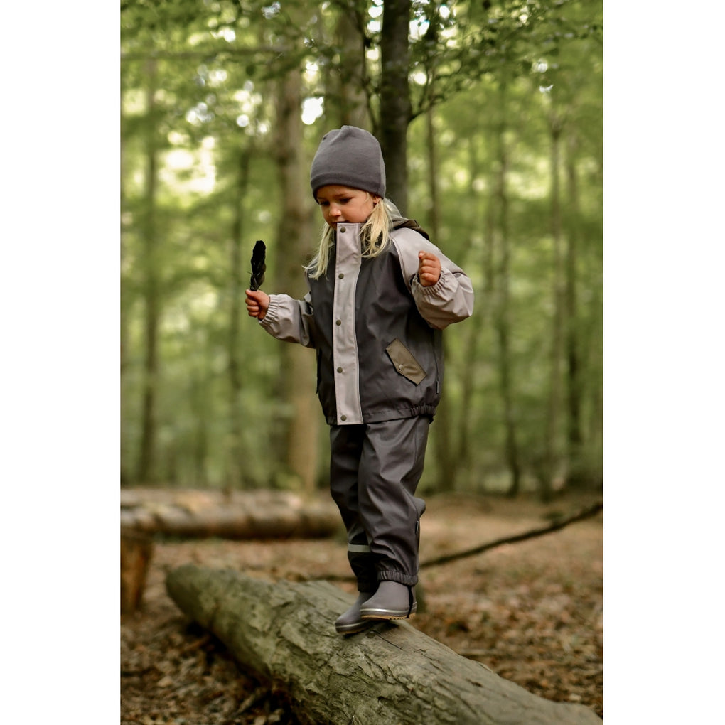 Varmt PU regntøj fra mikk-line, der er skabt til at børn kan trodse regnen og have det sjovt med at hoppe i vandpytter, glide ned ad den våde rutsjebane, lege i den våde sandkasse osv. Sættet består af en vandtæt regnjakke og regnbukser, der begge er lavet af genanvendt og blødt PU-materiale. Regntøjet er naturligvis uden skadelige fluorstoffer. Regnsættet har aftageligt blødt fleece foer inde i jakken og i bukserne, så dit barn kan blive ved med at have glæde af sættet, selvom når bliver varmere udenfor.